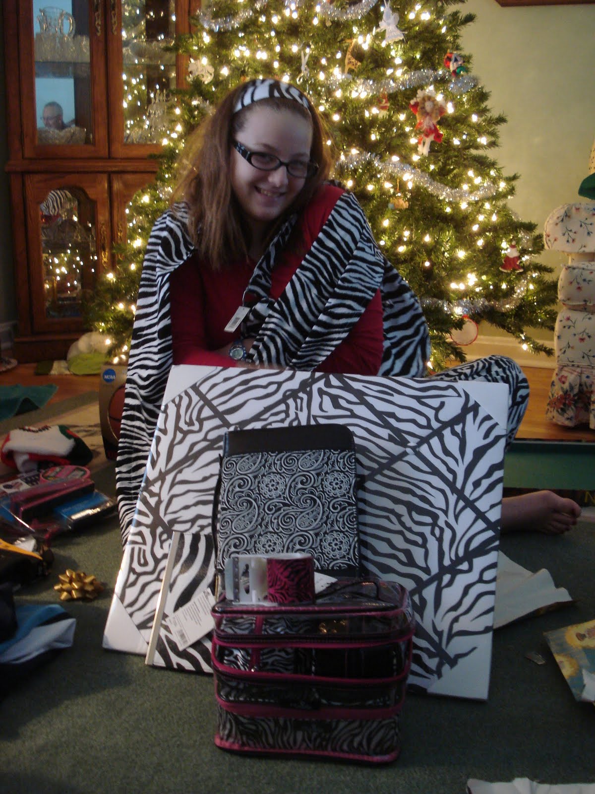 Christmas morning...can you even see my sister or is she camouflaged in a pile of zebra patterned presents?