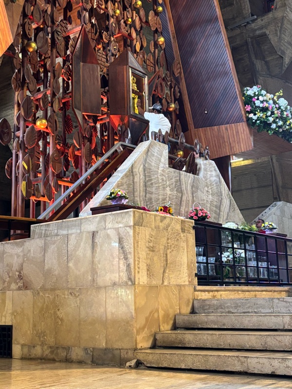 The most sacred object in the space is said portrait; there's a staircase that leads right up to it. As we descended, we paused to watch what we sadly recognized as idol worship: the visitors behind us in line, some bearing candles, holding objects such as letters and rosaries up to the glass and offering a prayer.