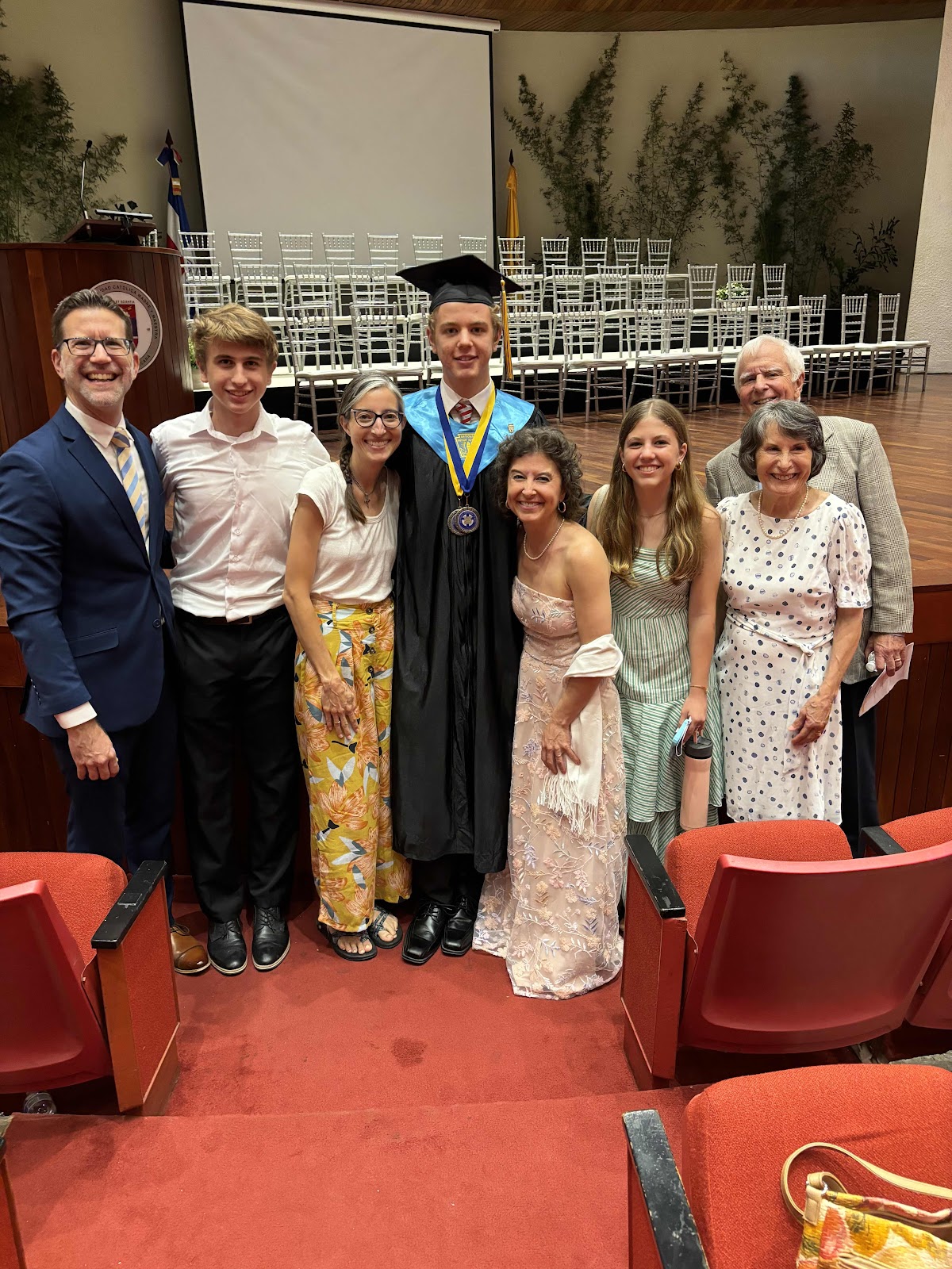 The Tuesday after I got back from my sister's wedding, I ate and ran at a DR all-team potluck in order to attend Santiago Christian School's graduation. Micah, the oldest son of a family I've grown close with through being members at the same church, graduated as the valedictorian AND won the school's highest character award. Dad Owen gave an outstanding Director's address, too. Pictured L to R are Owen, Jesse, me, Micah, mom Val, Abigail, and Val's parents Mary and Donald.