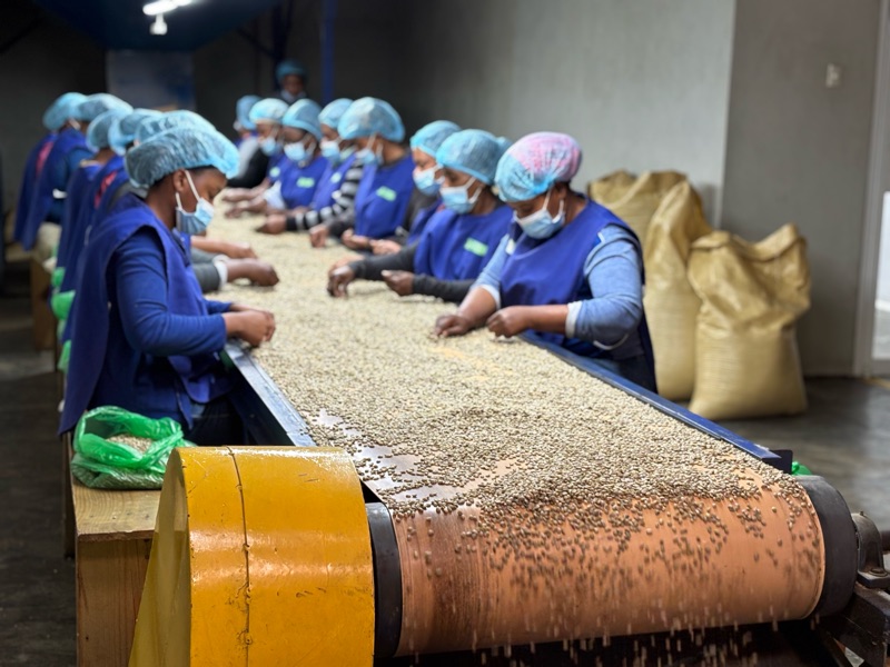 At scale, the same process is done by machine, which results in beans that are 10-15% defective. A team of 22 women (11 on each side) manually reduces that number to 2-3%.
