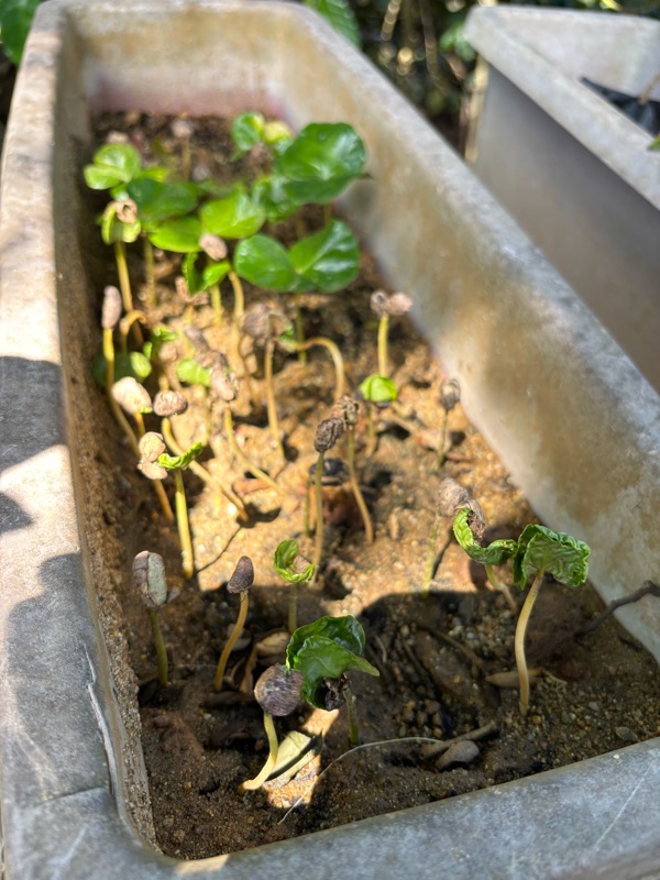 Coffee plants germinated in 100% sand. Seedlings progress from the "match" stage (foreground) to the "butterfly" stage before they're transplanted into 50% sand/50% soil.